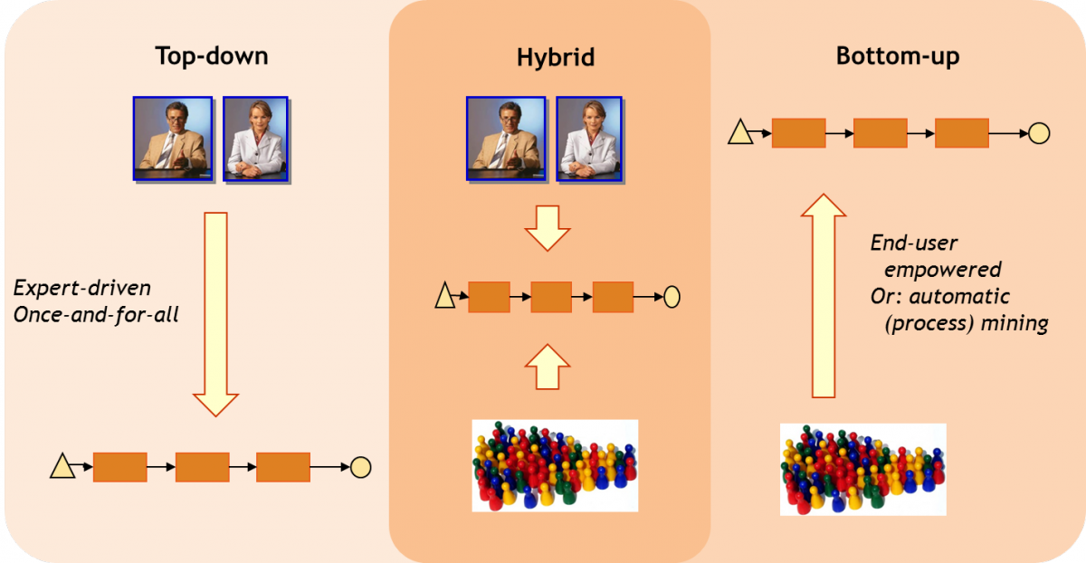 The approach is based on the insight that traditional “top-down” business process modelling approaches are too rigid and inflexible to capture the actual way processes are executed while pure “bottom-up” approaches may easily lose the focus and the alignment with organisational goals. Therefore, business process models are made agile and open by a joint hybrid approach. In order to achieve this vision, the strict distinction between build time and run time operations are softened. Process activities are presented to a user in a way that allows for individual adaptations. Any changes or enhancements to the process activities are documented and monitored. The advantage is two-fold: