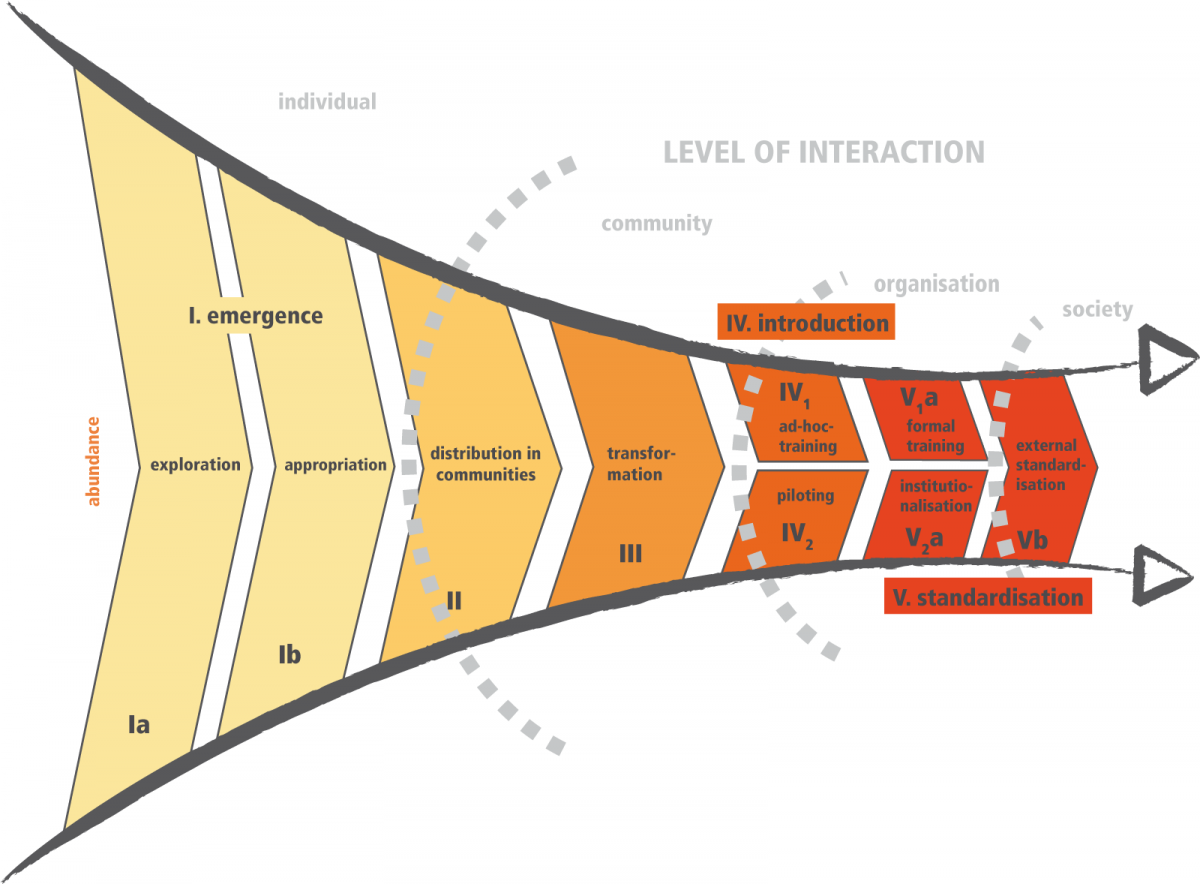- V. Standardization: The knowledge is further solidified and formally established in the organization to be used in repeatable formal trainings, work practices, processes, products or services. As in phase IV, we distinguish an instructional setting with standardised training activities, called formal training, and an experimental setting turning pilots into standard organizational infrastructure, processes and practices, called institutionalisation. The term standard, finally, also evoked the connotation of external standardisation initiatives which are similar for both settings, transcend the organizational boundaries and move knowledge maturing to the level of societies.