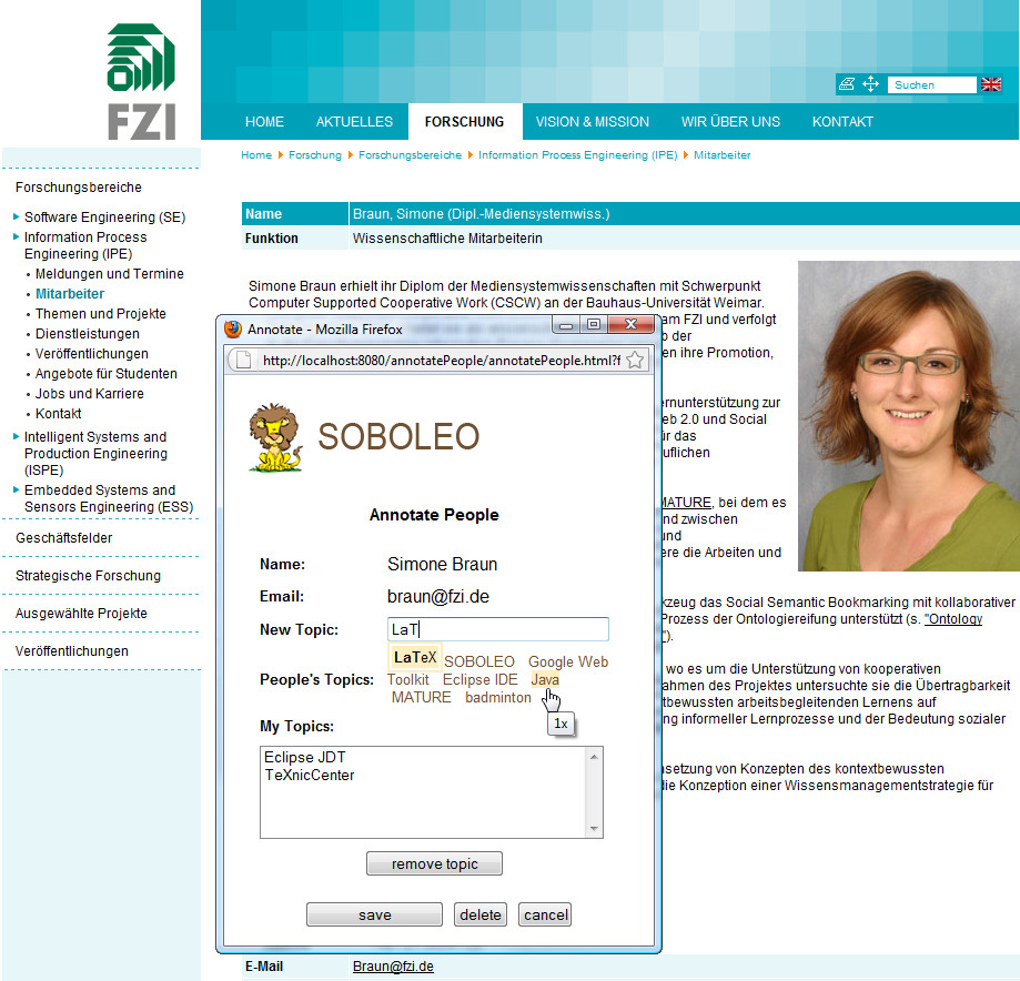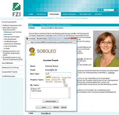 The people tagging tool is based on SOBOLEO, a web-based application realized with the Google Web Toolkit. The data representation is based on SKOS in a RDF repository. It is open for integration through its Web Service interfaces (both SOAP and REST are supported).