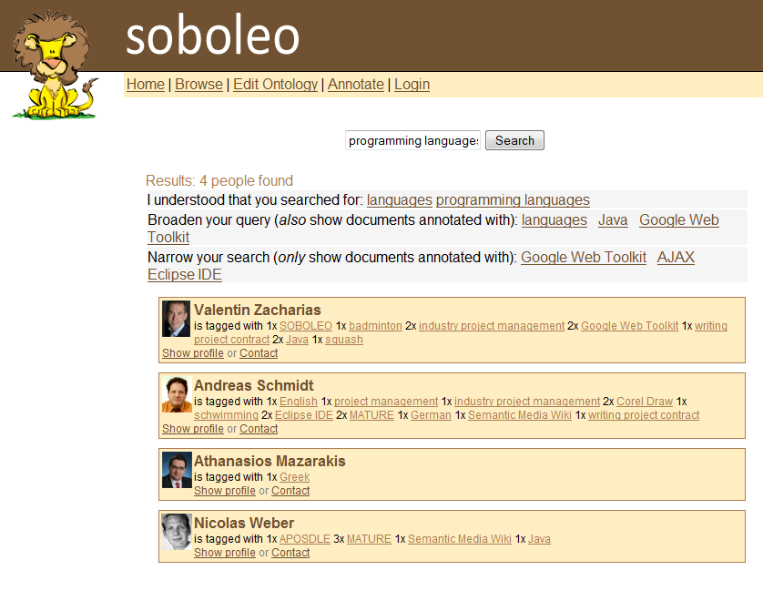 Semantic search for people, taking into account synonyms, broader and narrower terms, but also tag frequency, competencies of the taggee and several other heuristics