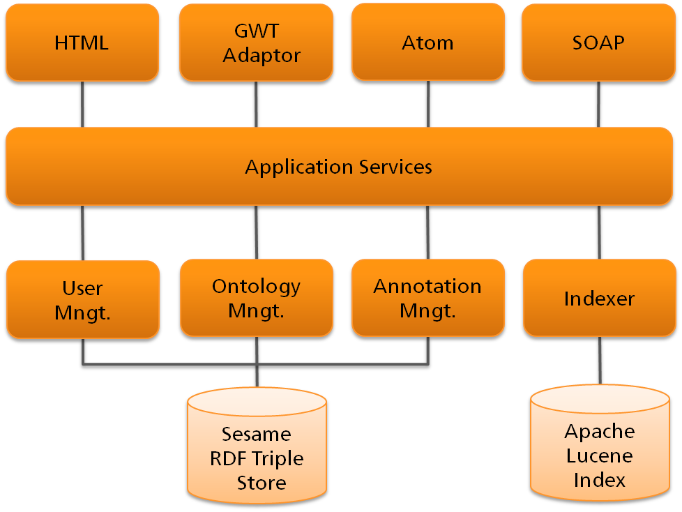- Domain Tier: manages the domain objects (user, ontology, annotation, documents) on top of the data storage